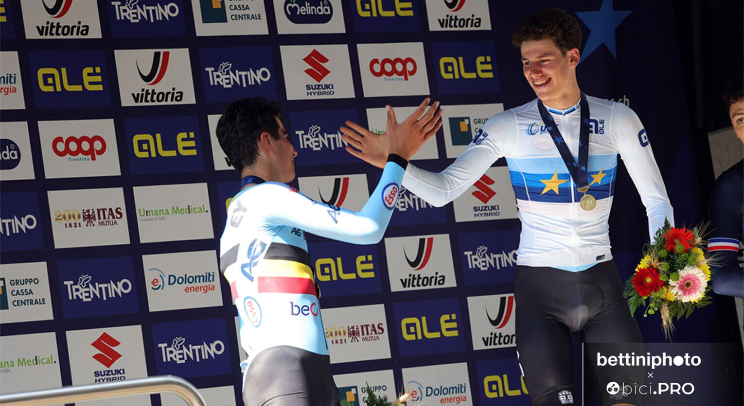 Alla fine però la medaglia d’oro è andata al 18enne belga Alec Segaert, già conoscenza di bici.PRO con il giudizio di Andrea Bardelli. Il neocampione europeo junior a cronometro ha pedalato a quasi 51 di media oraria, superando di 5” Uijtdebroeks e di 40” il francese Eddy Le Huitouze. Lo abbiamo sentito in mixed zone, mentre cede i fiori e la bottiglia di spumante ai genitori e ad un gruppo di suoi fans (con tanto di cappellini da ciclista con il suo nome).