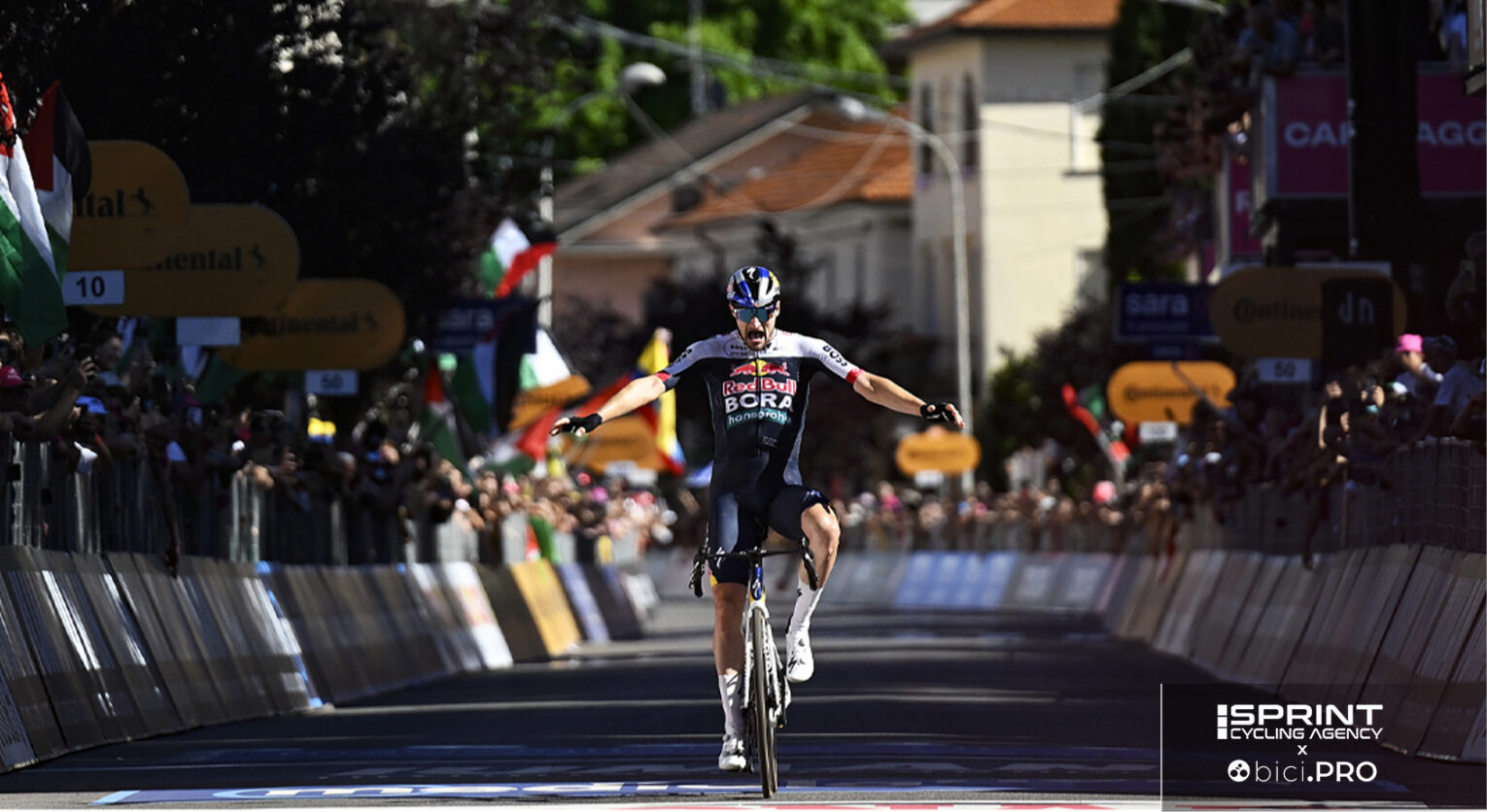 CESANO MADERNO – Uno scatto secco in una curva che girava a destra e non l’hanno più visto fino al traguardo. Nico Denz porta a casa la sua terza tappa al Giro d’Italia e la prima per la Red Bull-BORA-hansgrohe in questa edizione. Dopo la linea finale quasi non ci crede, sbatte la bici prendendola dalla parte alta del manubrio e digrigna i denti.